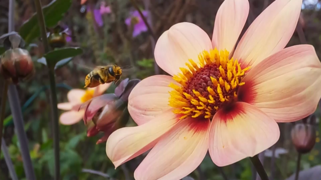 Honeybees captured on garden flowers in slow motion (240 fps).